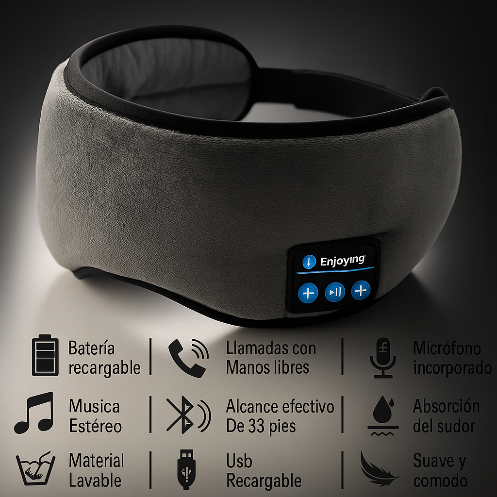 Relájate y duerme profundamente con este antifaz Bluetooth . Combina comodidad, sonido envolvente y diseño ergonómico para ofrecerte el descanso más placentero, sin cables ni distracciones. Ideal para dormir, viajar o meditar.