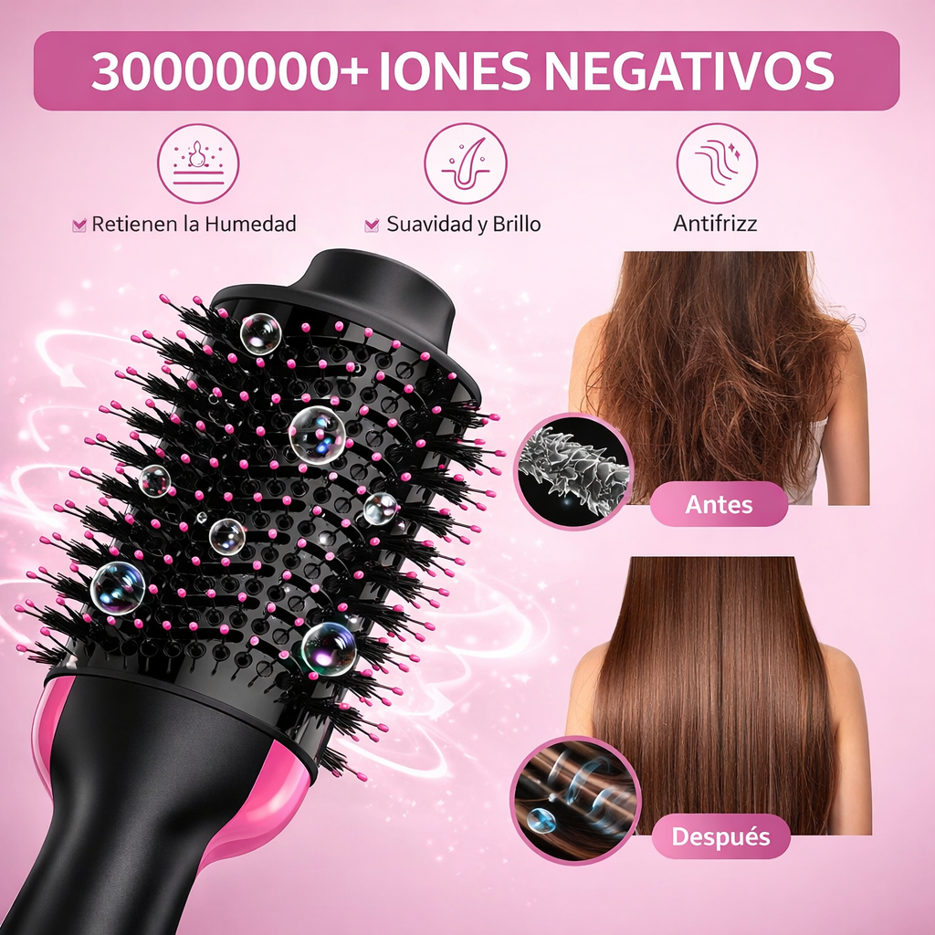 El cepillo combina secado y peinado en un solo dispositivo, permitiendo lograr un cabello suave, sin frizz y con forma en pocos minutos, sin maltratarlo y con menos calor que una plancha tradicional.