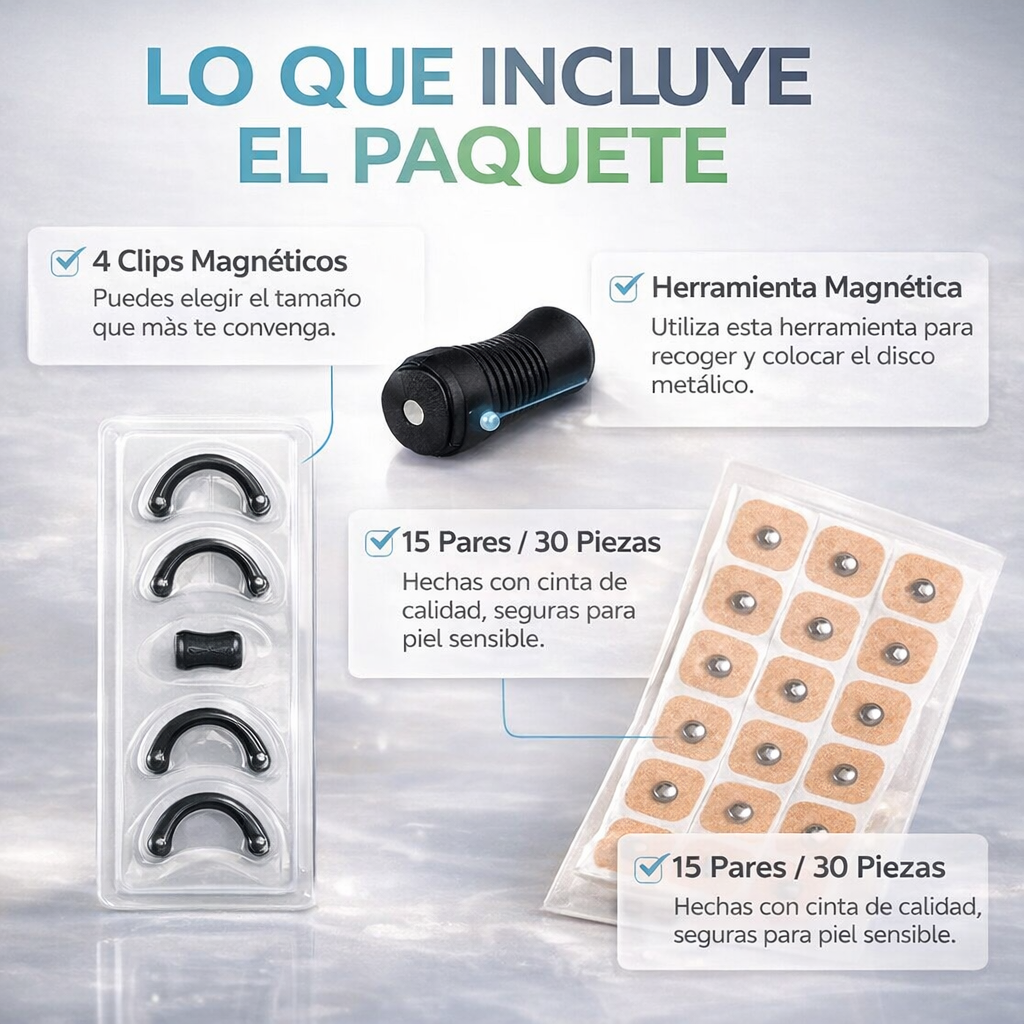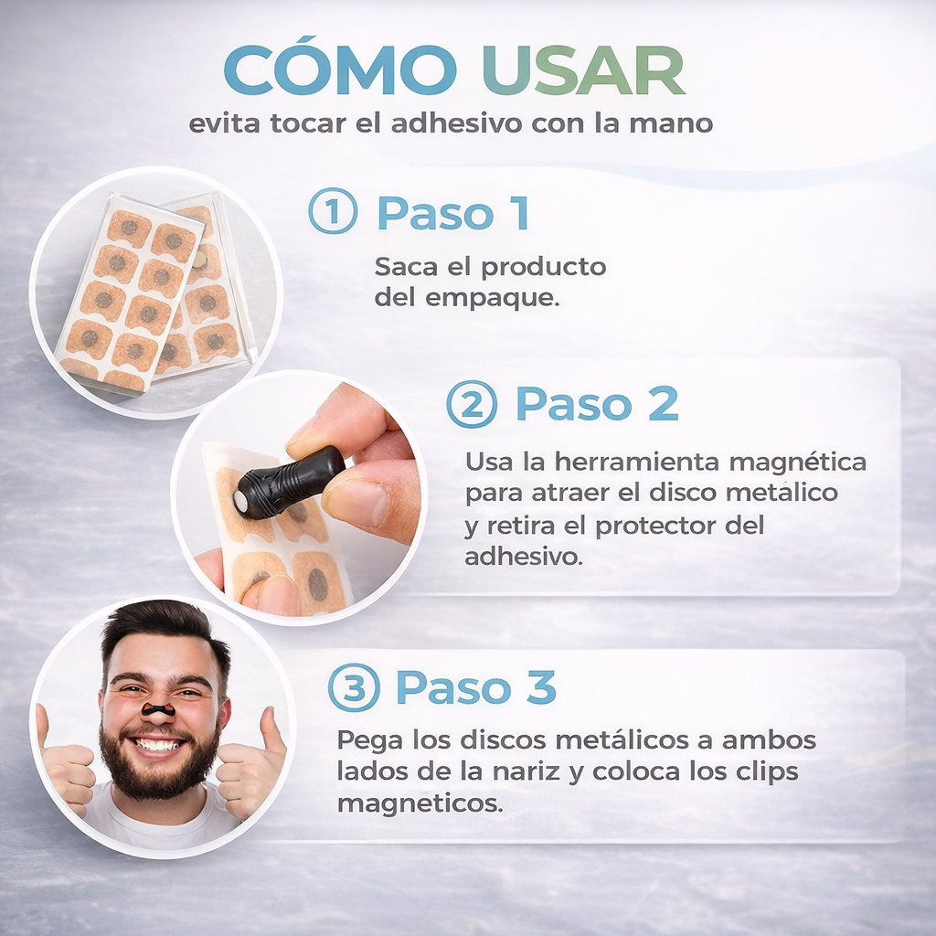 Primero, asegúrate de que la piel de la nariz esté limpia y seca. Luego, utiliza la herramienta magnética para retirar el disco metálico sin tocar el adhesivo con los dedos. Coloca un disco en cada lado de la nariz, justo sobre las alas nasales, y finalmente ajusta el clip nasal magnético sobre los discos.